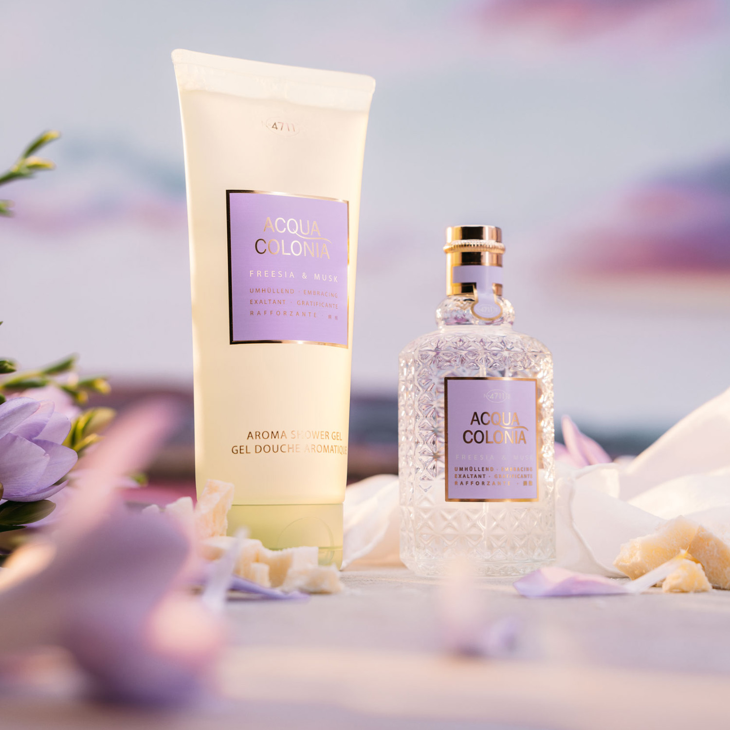 Fruchtige Blumennoten der Freesie und sanfte Moschus-Akzente lassen uns aufblühen. 4711 Acqua Colonia Freesia & Musk ist eine zarte und edle Kreation, die eine sanftmütige Aura verleiht!
