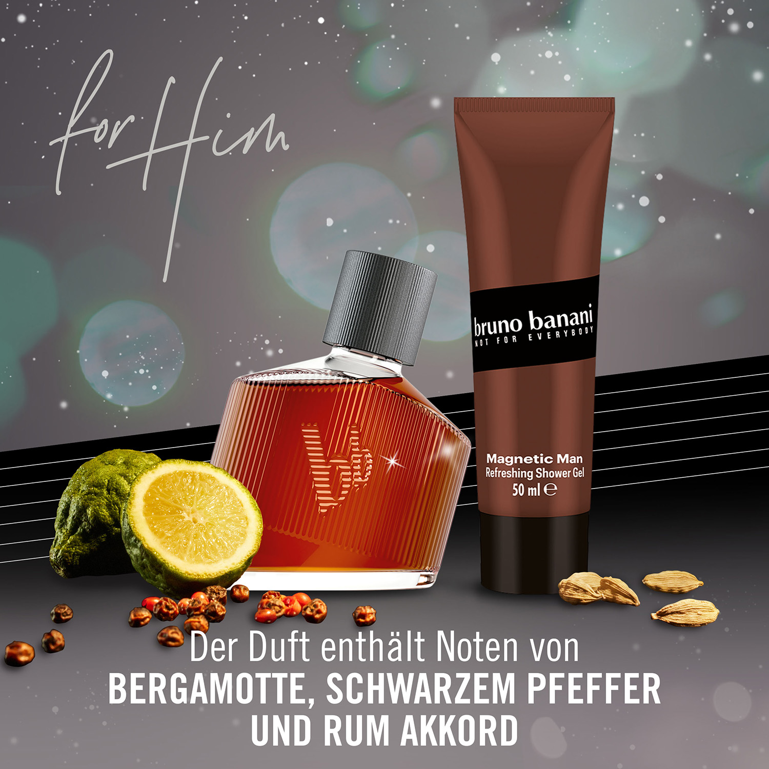 Im Auftakt kommt der Duft herrlich frisch daher, mit Noten von Bergamotte, Mandarine, Muskatellersalbei und einem pikanten Hauch von rosa Pfeffer. In der Herznote gesellen sich würzige Komponenten aus Kardamom, Wacholder, schwarzem Pfeffer und Muskatnuss hinzu, die ihm Charakter verleihen. Sinnlich-warm bettet sich die Komposition auf holzige Noten aus Akigalaholz, Benzoe, Rum-Akkord und Tonka – unwiderstehlich anziehend!